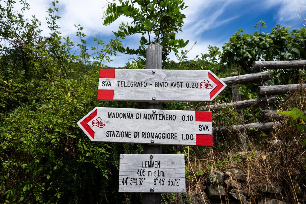 Giunti alla borgata Lemmen si apre effettivamente davanti agli occhi un ampio panorama sul mare e, in lontananza, s’intravede la litoranea. Signorini ne fu estasiato: «Sotto a noi, a’ piedi del monte che scendeva a picco nel mare, la punta del Cavo; di là, movendo a ponente verso Genova, la punta del Mesco; e in questa vasta insenatura, in cinque piccoli golfi, cinque paesi, le Cinque Terre. Chiuse in una stretta gola di monti, le case del capoluogo di questi cinque paesi, Riomaggiore; poi, al di là del monte, Manarola; poi, sopra una vasta spiaggia, Corniglia; dopo, al di là di altri monti, Vernazza; ultimo, tra molti boschi di ulivi e di aranci, ai piedi del Mesco, Monterosso». Poi si scende dolcemente verso il Santuario di Nostra Signora di Montenero, uno dei cinque santuari mariani delle Cinque Terre, come fecero i tre macchiaioli. Il Santuario è un luogo molto caro ai riomaggioresi, gelosamente custodito. Il dipinto della Vergine, secondo una leggenda altomedievale e bizantina eseguito dal vivo, è in realtà un olio su tela probabilmente del XVI secolo. Da qui si scende lungo la Via Grande, utilizzata per la processione al Santuario in occasione della Festa della Vergine, seguendo le 13 edicole votive dedicate alla Madonnax.