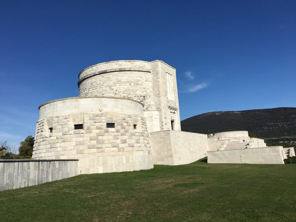 Accanto a ogni panchina c’è una postazione Qrcode inquadrando il quale il padrone di casa racconta cosa si vede seduti su quella panchina: un invito a spaziare con lo sguardo che supera i confini anche linguistici: i testi infatti sono in italiano, inglese, tedesco e sloveno. A due passi c’è uno dei luoghi simbolo della Grande Guerra, l’ossario di Oslavia. Sono 57mila i caduti della Grande Guerra che riposano qui, quasi tutti italiani. Oltre la metà non ha un nome. Le torri dell’ossario sono in pietra bianca, come il muro di Lenzuolo Bianco. Si respira un grande silenzio. Il vino, come il dolore, ha radici profonde.