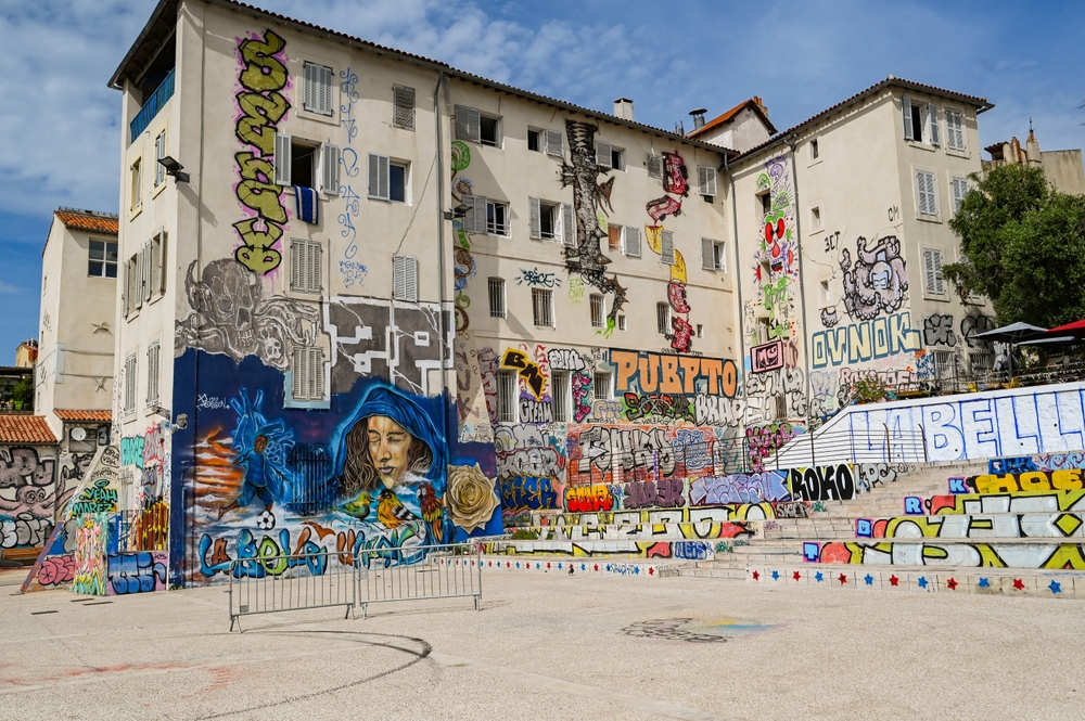 Quando il sole è abbastanza alto, verso le dieci e mezza, salite verso il Quartier du Panier. Le viuzze strette in questa ora si riempiono di una luce radente che esalta i colori della street art: enormi murales coprono intere facciate, trasformando quello che un tempo era il quartiere più malfamato della città in una galleria d'arte a cielo aperto. Tra montée des Accoules e rue du Panier, botteghe artigiane vendono saponi di Marsiglia autentici, ceramiche dipinte a mano e gioielli d'artista.