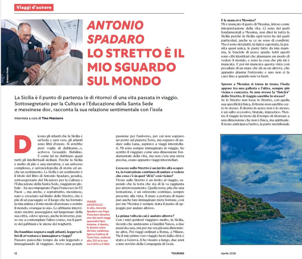 La Sicilia è un sentimento è il titolo del nuovo libro di Antonio Spadaro, gesuita, sottosegretario del Dicastero per la Cultura e l'Educazione della Santa Sede, e viaggiatore globale che ha accompagnato Papa Francesco in 63 Paesi. Ma soprattutto, messinese doc — nato e cresciuto sul limite dello Stretto, che per lui è «il luogo che ha formato la mia anima e il mio modo di pensare e sentire il mondo, ovunque io sia».