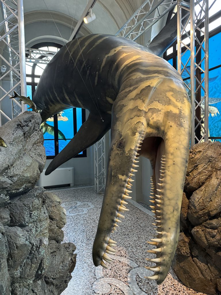 Quella appena inaugurata al Museo Kosmos dell'Università di Pavia è una mostra che conosce pochi paragoni. Per vari motivi: perché è raro ammirare tutte insieme 50 ricostruzioni di animali preistorici a grandezza naturale (alcuni sono davvero grandi), estremamente realistici e incredibilmente impressionanti; perché tutte queste ricostruzioni sono certificate da paleontologi e aggiornate secondo gli studi più attuali, e non è certo scontato, in un mondo che tende sempre più alla spettacolarizzazione senza preoccuparsi della verità scientifica; e perché finalmente si punta l'attenzione non tanto sugli inflazionatissimi dinosauri - quelli terrestri, per intenderci, dal tirannosauro allo stegosauro - ma sui rettili che abitavano i nostri mari milioni di anni fa, soggetto molto meno rappresentato e comunicato al grande pubblico.