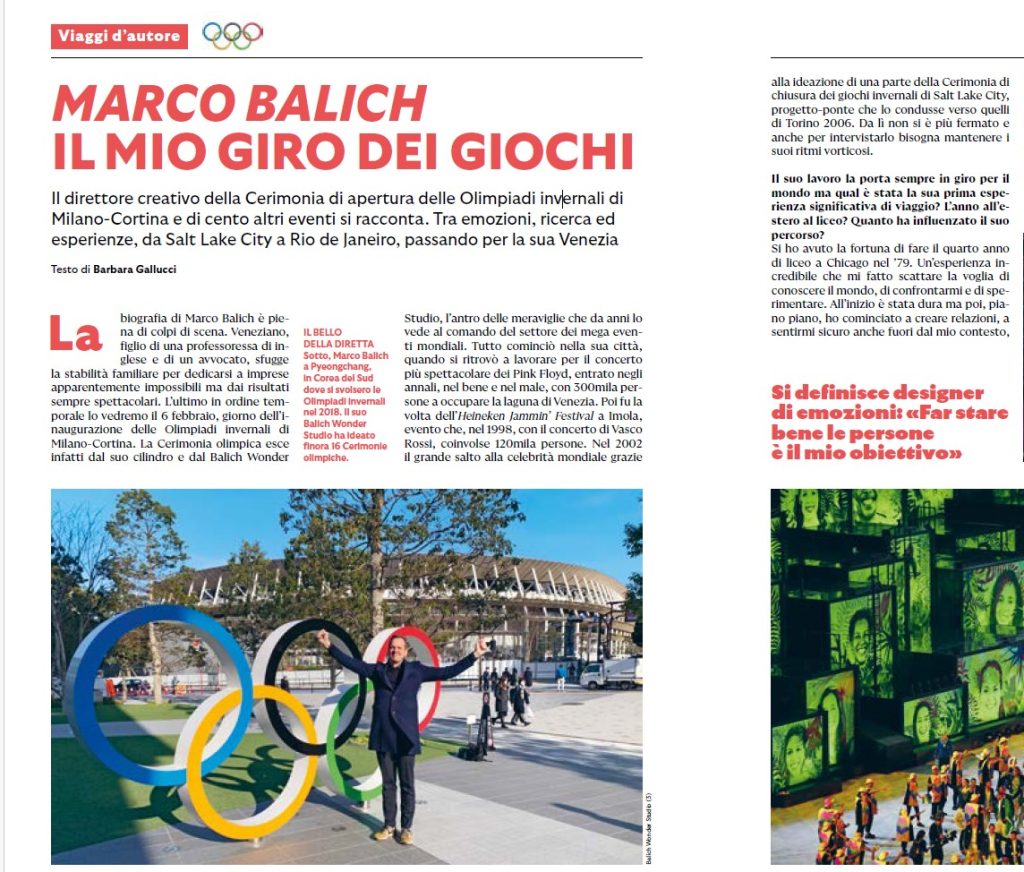 La Cerimonia olimpica esce infatti dal suo cilindro e dal Balich Wonder Studio, l’antro delle meraviglie che da anni lo vede al comando del settore dei mega eventi mondiali. Tutto cominciò nella sua città, quando si ritrovò a lavorare per il concerto più spettacolare dei Pink Floyd, entrato negli annali, nel bene e nel male, con 300mila persone a occupare la laguna di Venezia.