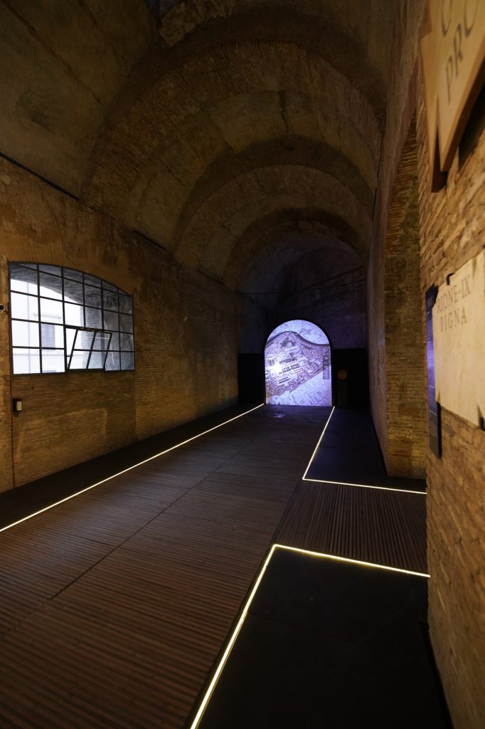 Il percorso si apre poi al paesaggio monumentale del Campo Marzio. Una proiezione in rotazione, attivata dal visitatore tramite un comando rotante, permette di passare con fluidità da una fase topografica all’altra, in dialogo ideale con una selezione simbolica reperti – di epoche diverse – rinvenuti durante gli scavi di isolamento del Pantheon ed esposti lungo le pareti laterali. Un video realizzato grazie ai materiali dell’Archivio Luce Cinecittà riporta agli anni Trenta, nel cuore dei grandi restauri novecenteschi del monumento.