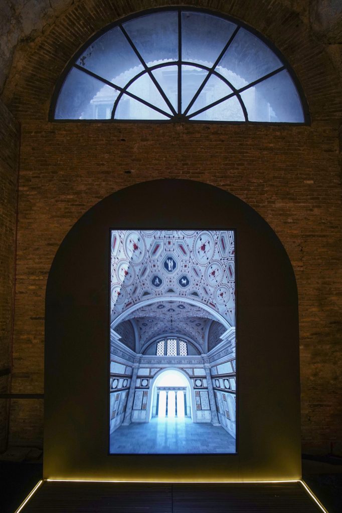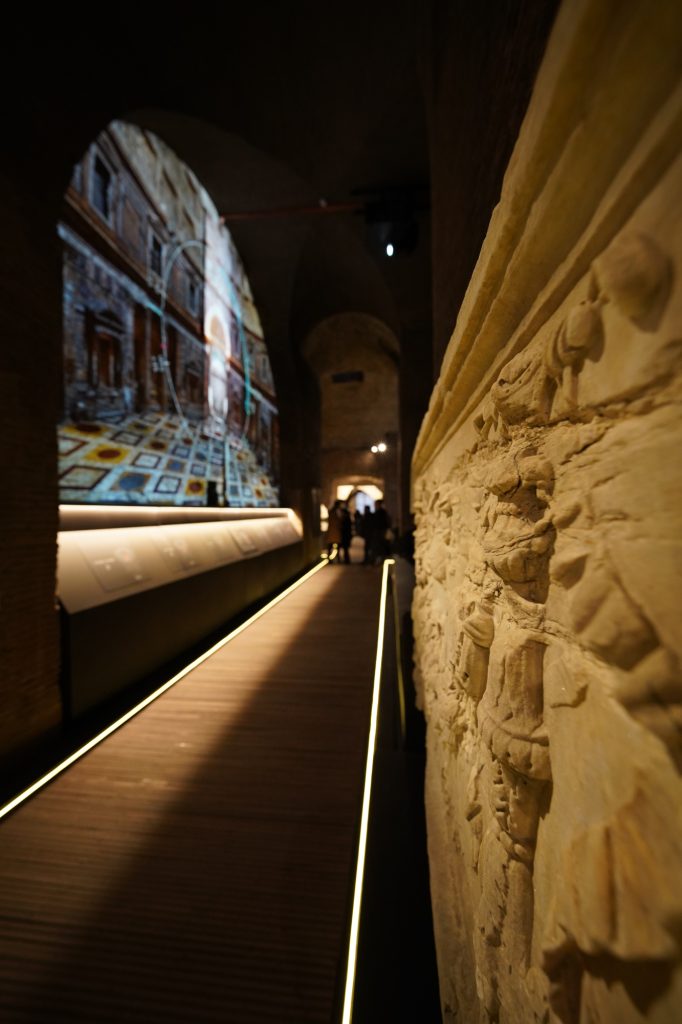La visita si apre con un videomapping immersivo proiettato sulla parete che separa questi ambienti dalla Rotonda: una spettacolare – e al tempo stesso scientificamente rigorosa – “scomposizione” visiva del diaframma introduce il pubblico agli straordinari effetti luminosi dell’Oculus nei momenti astronomici e rituali più significativi dell’anno.