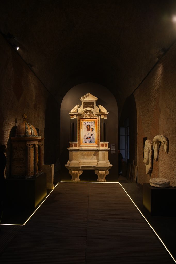 La sezione successiva è dedicata al Pantheon cristiano, raccontato attraverso opere e frammenti che ne documentano le trasformazioni dal 609 all’età moderna. Particolarmente suggestiva è la ricomposizione in scala 1:1 del ciborio altomedievale, con le sue raffinate decorazioni a pavoni e motivi vegetali, simboli di vita eterna. Accanto ad esso, un affresco del XIV secolo – proveniente dalla decorazione medievale della Cappella Maggiore e staccato quando il Pantheon divenne sede delle tombe reali – viene presentato dopo un accurato restauro che ne ha restituito la straordinaria ricchezza cromatica.