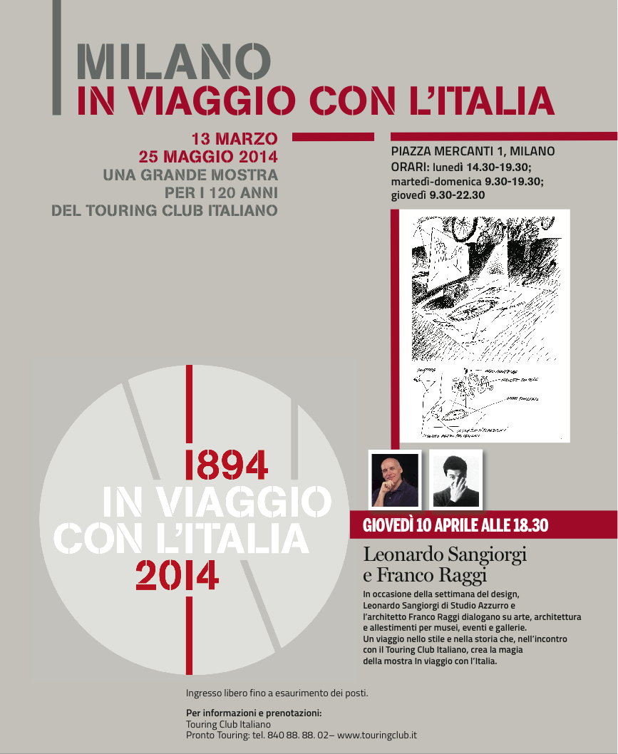 Continuano gli appuntamenti con i compagni di viaggio del Touring Club Italiano in occasione della mostra "In viaggio con l'Italia" allestita al Palazzo della Ragione di Milano. Questa settimana, in concomitanza anche con la Design week, giovedì 10 aprile alle 18.30 saranno ospiti d'eccezione Leonardo Sangiorgi di Studio Azzurro, che ha ideato e progettato la mostra, e Franco Raggi, architetto e autore di numerosi progetti, tra i quali la Fondazione Ferré a Milano, e allestimenti, compreso uno negli stessi spazi dove ora si svolge quella del Tci.